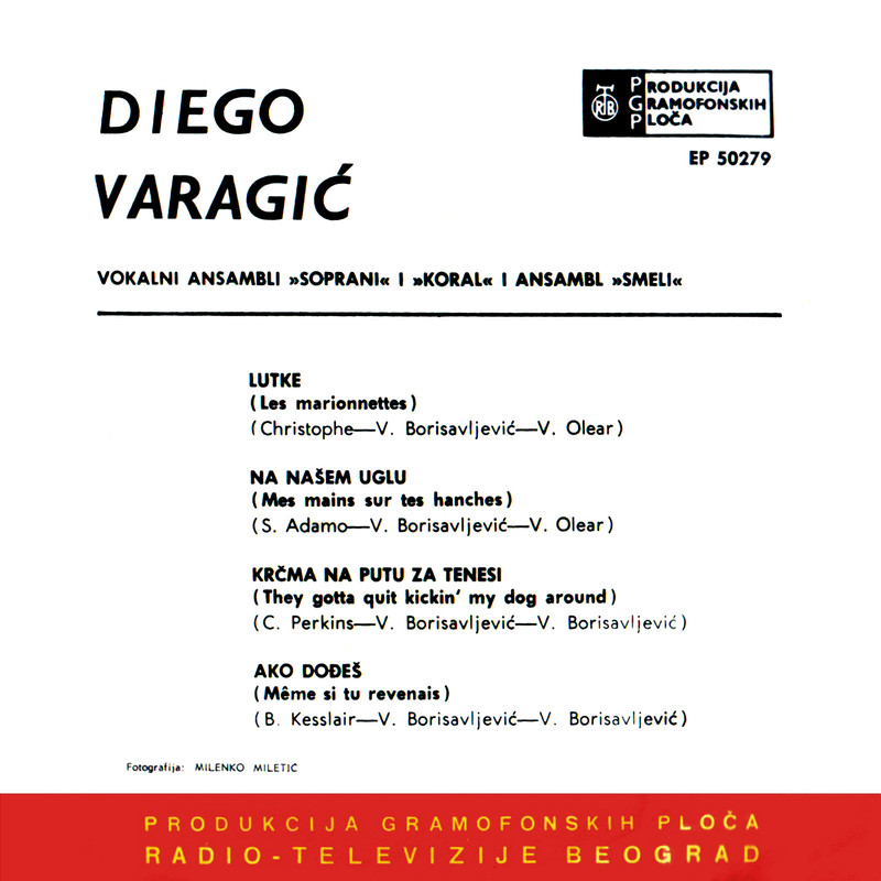 DIEGO VARAGIĆ is one of the most popular Yugoslav singers from the 1960s. He was born on the 12th of May, 1942 in Čajniče, Bosnia & Herzegovina. As a child he moved to Serbia, where he began his artistic career at the age of 12 in a choir (KUD "Železničar"). In 1961 he took part in the famous Radio Beograd show "Mikrofon je vaš". He studied English literature in Beograd and after a rather short singing career continued working in his main profession as teacher and journalist in Beograd. He has lived and worked in Italy since 1991. This is his most succesful EP from 1965.